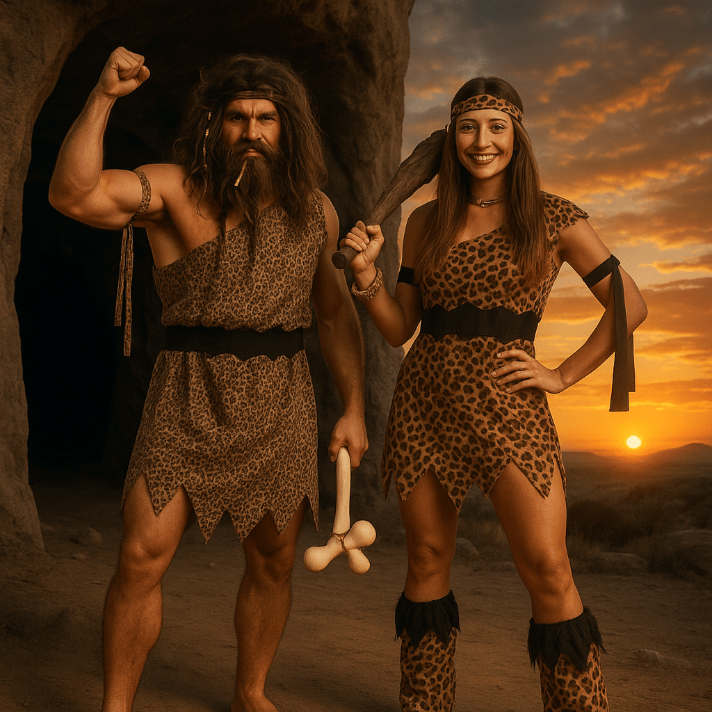 Los disfraces de trogloditas son versátiles, cómodos y permiten jugar con una estética única. Confeccionados con telas que imitan pieles de animales, huesos decorativos y peinados alocados, estos trajes evocan el pasado más remoto con un toque muy actual. Además, es una de las pocas temáticas que se adapta perfectamente tanto a grupos como a parejas, familias e incluso a mascotas.